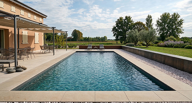 Il bordo per piscina Sarzano Made in Italy in gres con finitura toro è la soluzione ideale per valorizzare la piscina con un design elegante e armonioso.