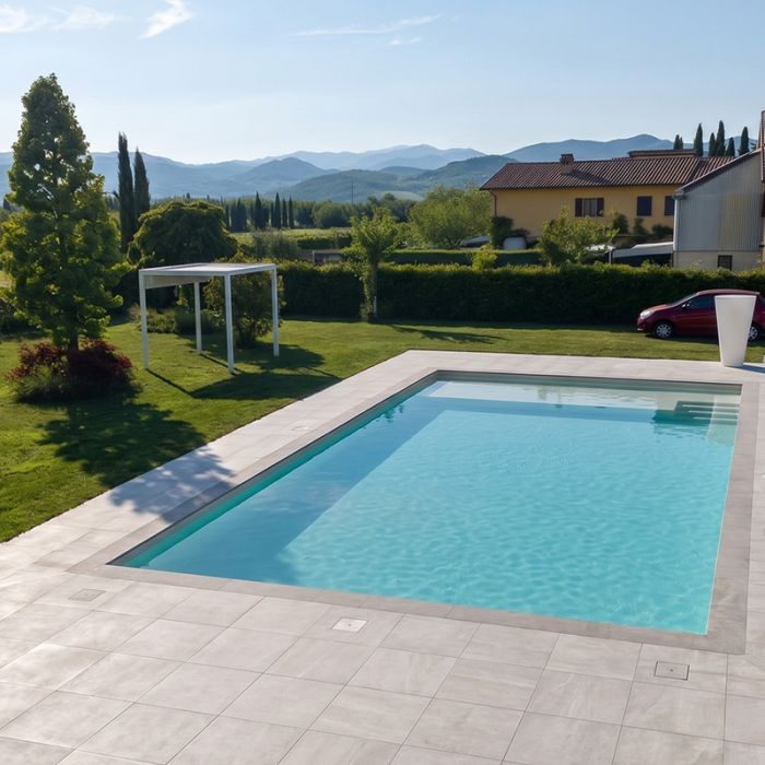 Bordo per piscina Sarzano in gres di eccellenza Made in Italy, proposto nella variante Standard con taglio netto a 90°.
