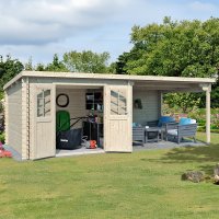 La struttura blockhouse garantisce stabilità e isolamento, mentre la doppia porta con maniglia e serratura aggiunge sicurezza e praticità.