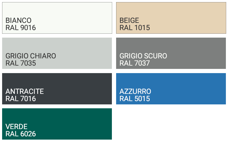 Oltre ai colori qui esposti, siamo in grado di realizzare altre colorazioni su richiesta. Richiedi un preventivo gratuito al numero 0522/15.36.417 per maggiori informazioni.