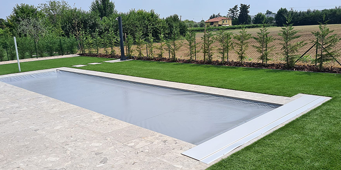 Il meccanismo automatico, invece, va interrato in un apposito vano da realizzare che permette di far "scomparire" il telo, mostrando la bellezza della tua piscina.