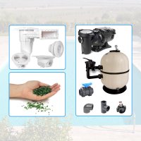 Ogni kit prevede l'impianto di circolazione con 2 bocchette, così da essere conforme alle normativa anti intrappolamento, e filtrazione a scelta tra sfuso, su pallet o in locale tecnico preassemblato.