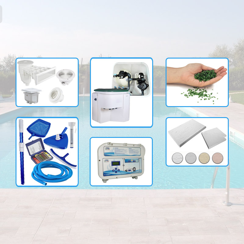 I kit più accessoriati hanno anche i bordi, i kit di pulizia, il sistema di illuminazione notturno, la centralina per il dosaggio automatico dei prodotti chimici.