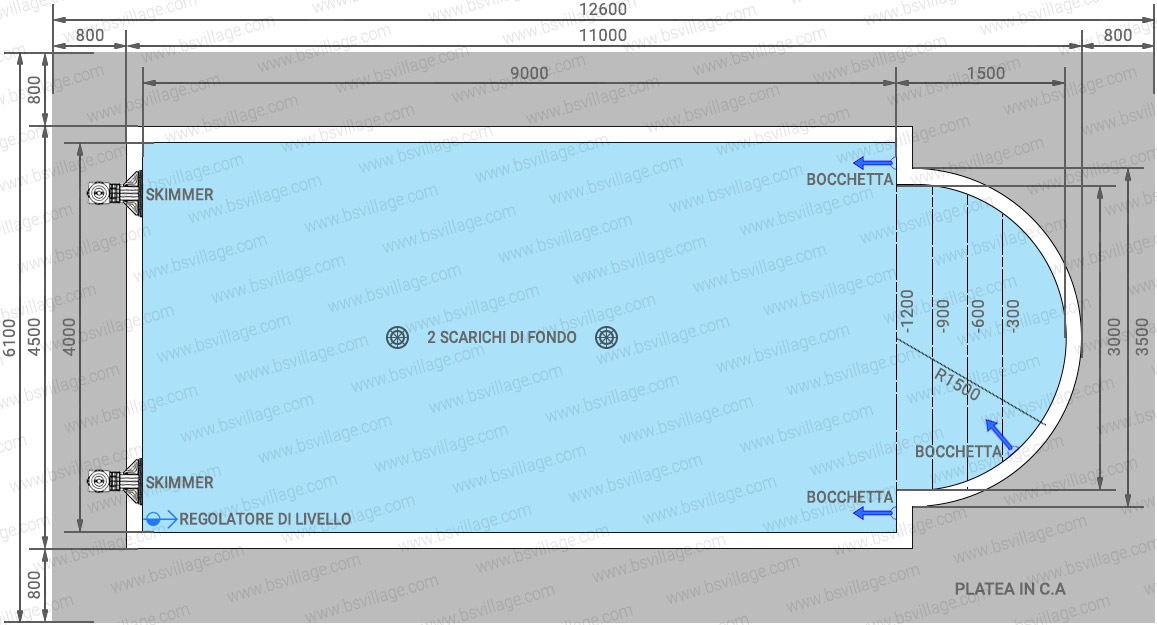 La struttura della piscina sarà realizzata in cemento, secondo i tuoi desideri, da un'impresa edile di tua fiducia e BSVillage ti fornirà tutto l'occorrente per i sistemi di filtrazione, circolazione, illuminazione, pulizia ecc. per trasformare una vasca in una piscina!