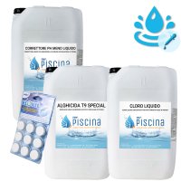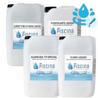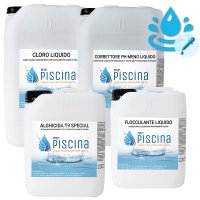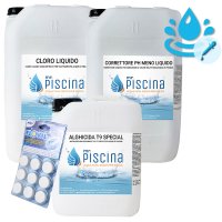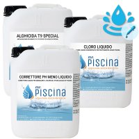 Kit mix di prodotti chimici per il mantenimento delle acque della piscina interrata o fuori terra. Adatto anche per pompa dosatrice pH e Redox-Cloro.
