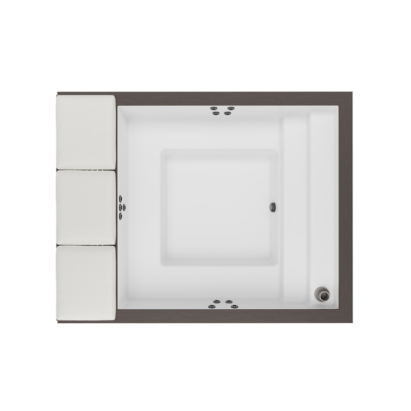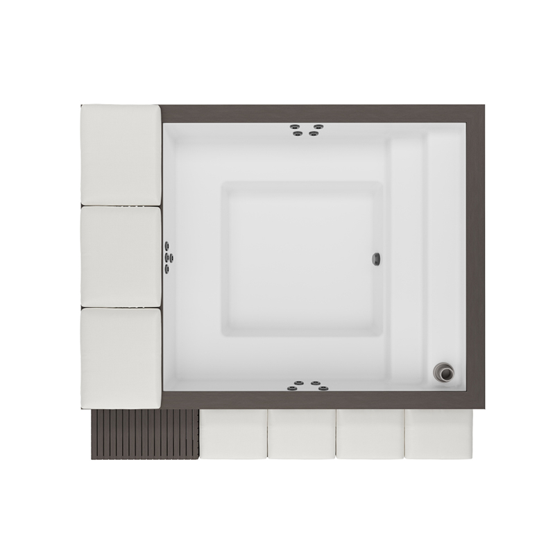Ciò che rende unico questo modello è la sua capacità di trasformarsi in un elegante complemento d'arredo living. La struttura esterna include una raffinata zona relax a bordo vasca, disponibile in due diverse configurazioni per adattarsi perfettamente ai tuoi spazi:
