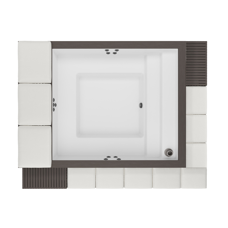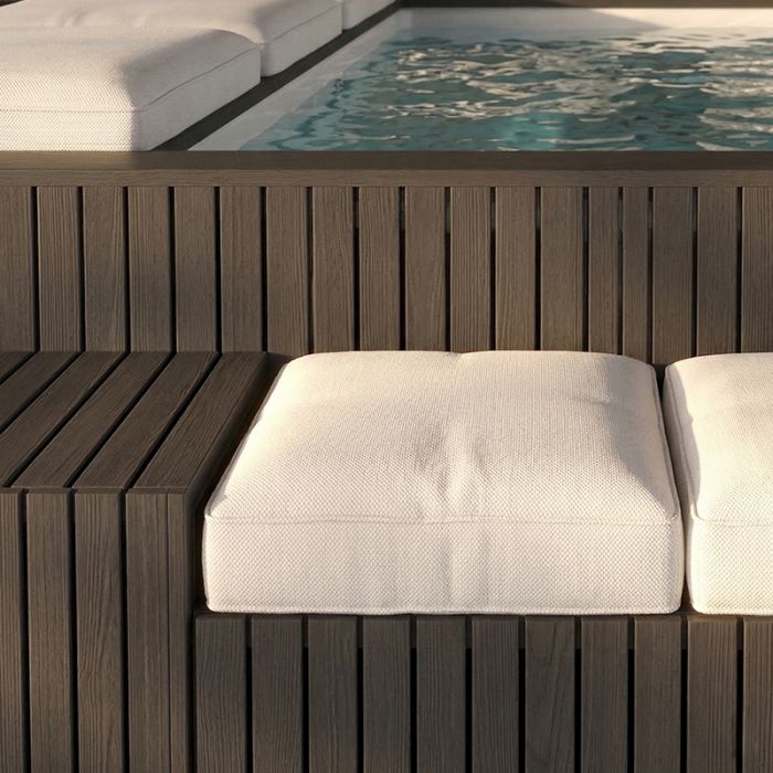 L'ampia cuscineria e le basi coordinate permettono di vivere l’esperienza wellness anche fuori dall'acqua, trasformando il bordo vasca in un esclusivo solarium o in un angolo di condivisione perfetto per ogni momento della giornata.