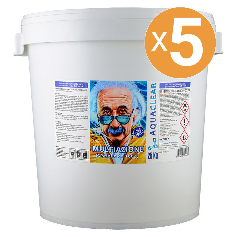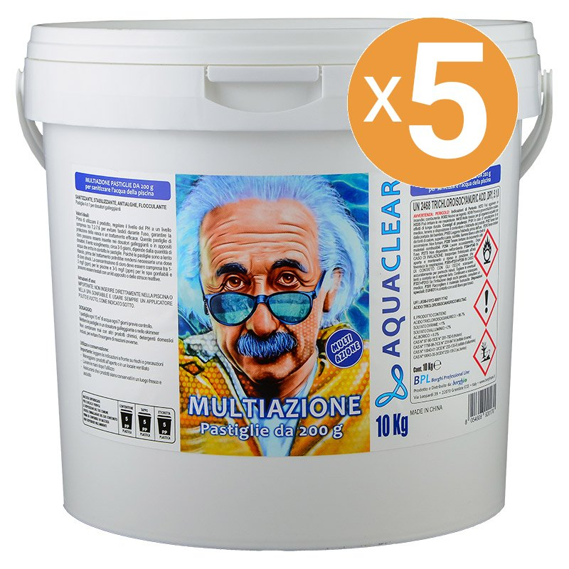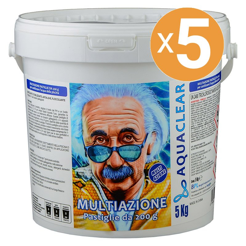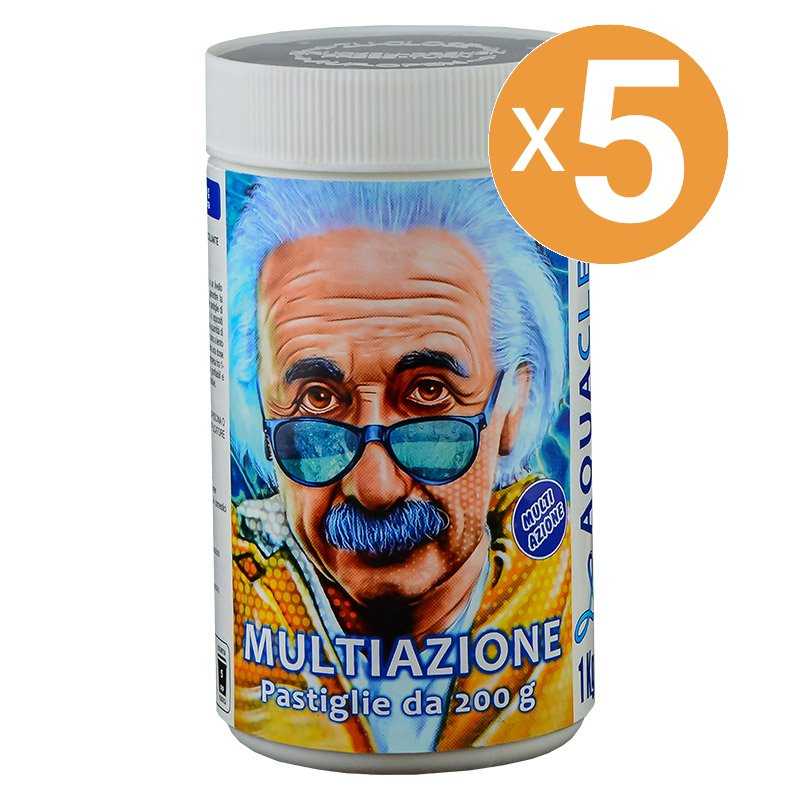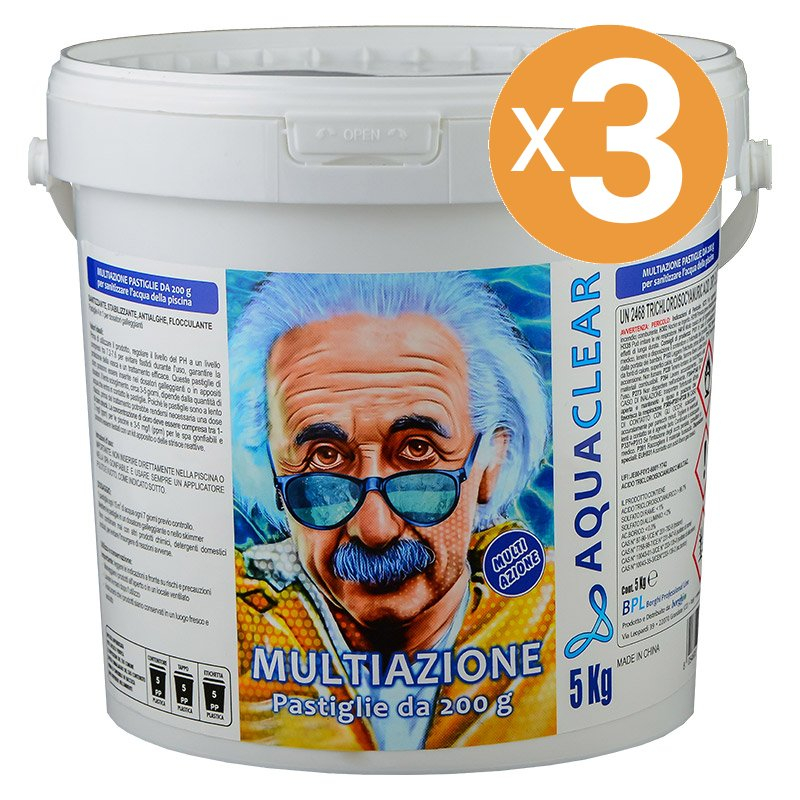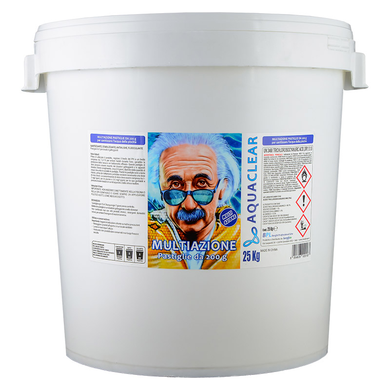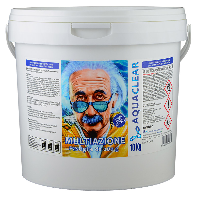 Le pastiglie multiazione da 200 g sono ideali per la cura e la sanitizzazione dell’acqua della piscina. Grazie alla loro formulazione completa, svolgono contemporaneamente un’azione sanitizzante, stabilizzante, antialghe e flocculante.