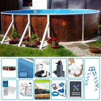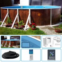 La piscina fuori terra della serie AZURO WOOD è realizza con struttura in acciaio trattato contro la corrosione e rivestita con fantasia effetto legno, per mimetizzarsi al meglio con la natura del giardino circostante.
