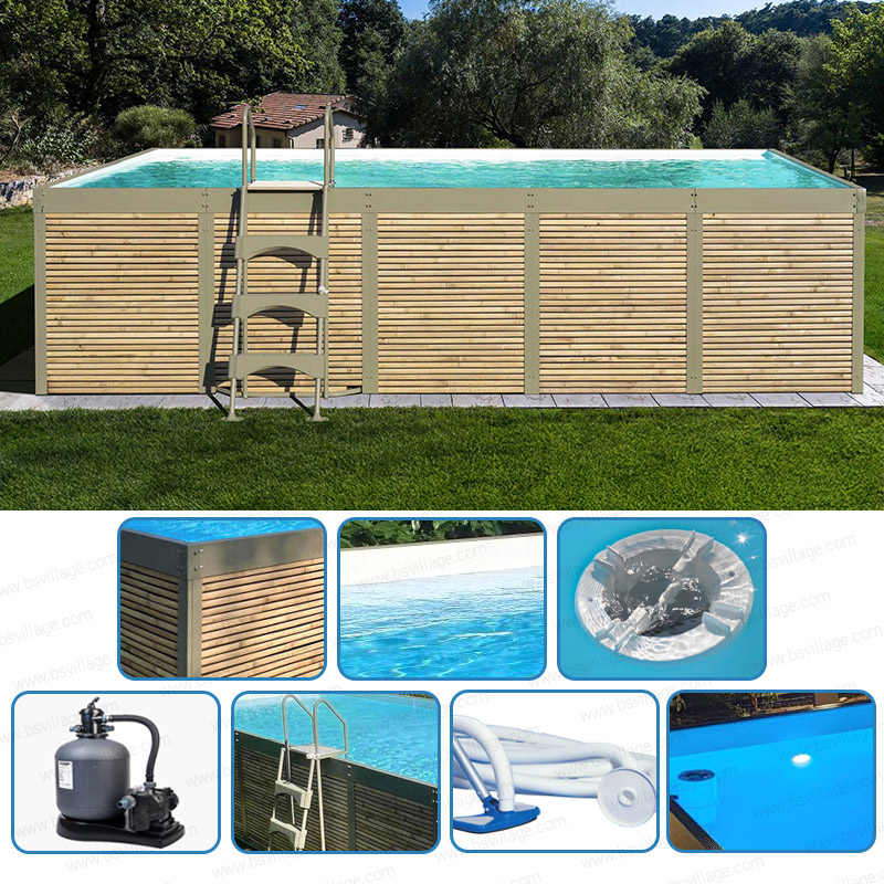 Per accedere alla vasca, la piscina ANTEA è dotata di scaletta di sicurezza, con struttura in acciaio, gradini in plastica ad alta resistenza e piattaforma in legno composito.