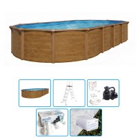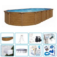 Piscina STEELWOOD Omega ovale con struttura in acciaio zincato a caldo e verniciatura effetto legno. La bellezza del legno e la solidità del metallo si combinano per creare una piscina elegante e ideale per qualsiasi tipologia di giardino.