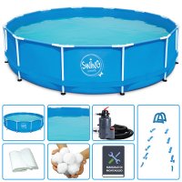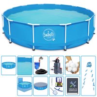 Questa piscina è dotata di struttura autoportante in acciao con telo azzurro. Duraturo e di qualità, il telo della vasca è in triplo strato di PVC e poliestere, al contempo flessibile e resistente.