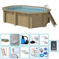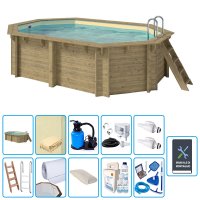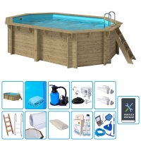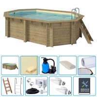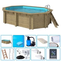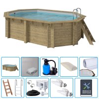 EcoWood 486 è proposta in due versioni: Kit BASE che include tutto l'occorrente per una corretta messa in funzione della piscina, tra cui un impianto di filtrazione monoblocco e sabbia quarzifera.