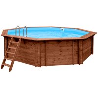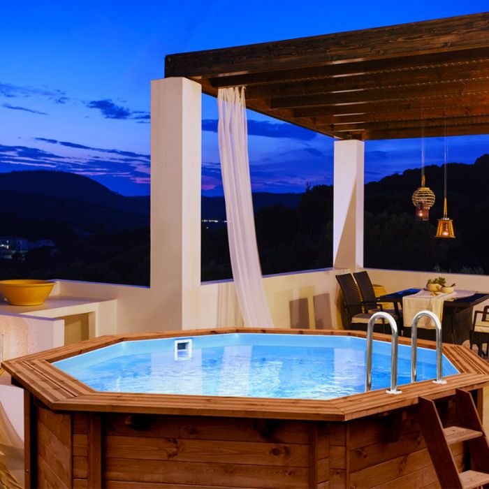 Piscina in legno trattato in autoclave e con ulteriore trattamento Premium. Pareti in legno massello con spessore 45 mm.