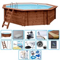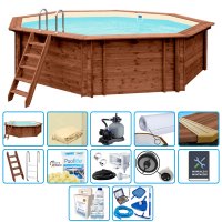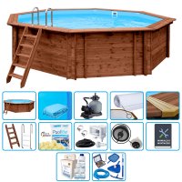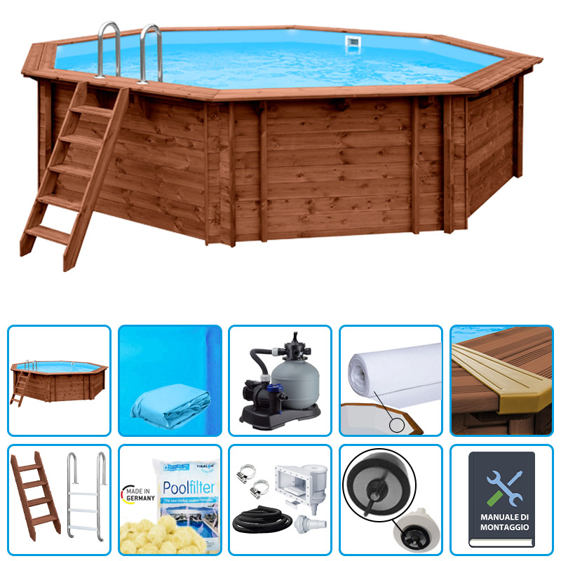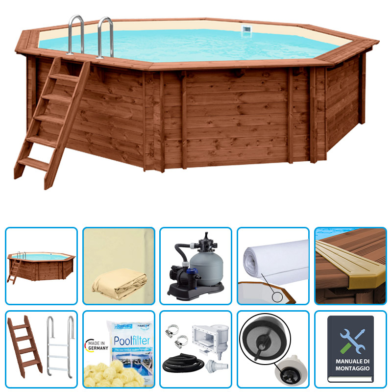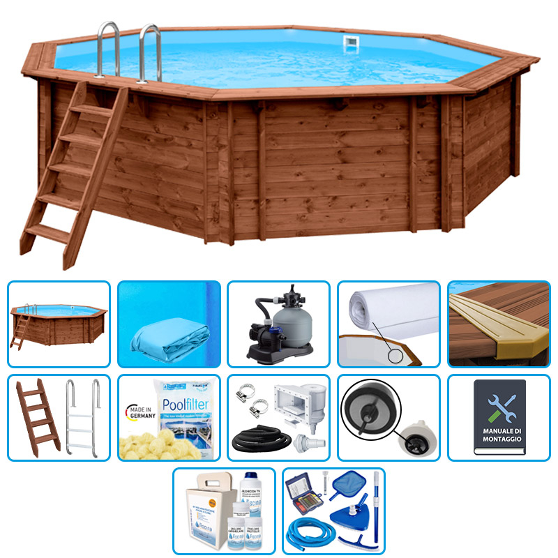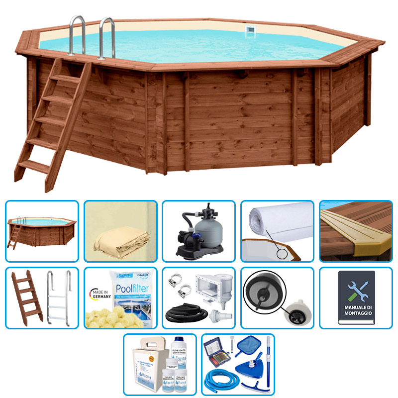 NaturalWood Premium 517 è proposta in due versioni: Kit BASE che include tutto l'occorrente per una corretta messa in funzione della piscina, tra cui un impianto di filtrazione monoblocco e FIBALON Giallo, un materiale filtrante innovativo sostitutivo della sabbia, pratico e leggero da maneggiare e dotato di un'alta densità e superficie di filtrazione.