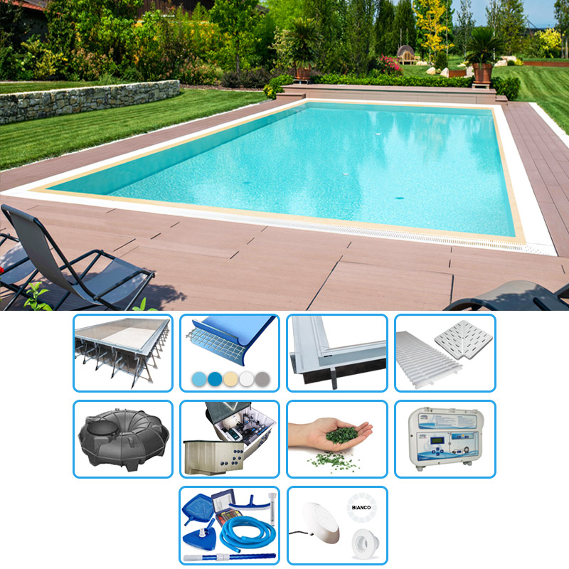 - Kit SENZA PENSIERI: ideato per rendere ancora più semplice e comodo il trattamento della piscina grazie alla centralina di regolazione automatica cloro e pH. La scala interna angolare invece rende la piscina ancora più funzionale, moderna ed elegante.