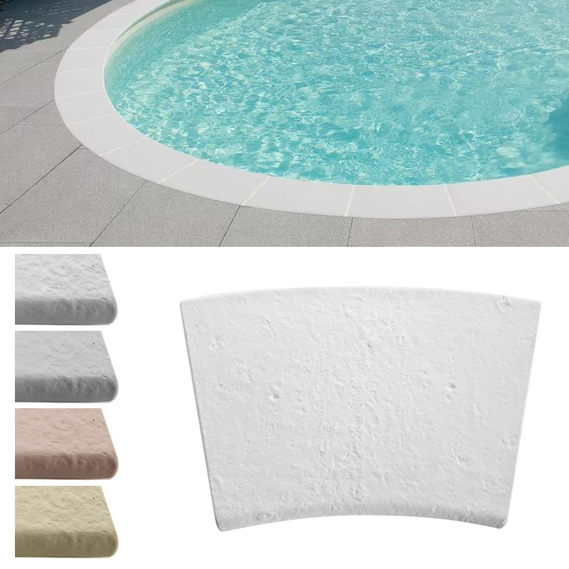 Ogni pezzo viene realizzato artigianalmente e questo conferisce al bordo caratteristiche estetiche e prestazionali uniche, inoltre il particolare motivo sulla superficie lo fa apparire rustico e raffinato al tempo stesso. Per adattarsi con precisione al perimetro della piscina i bordi dovranno essere sagomati in opera a cura del posatore.