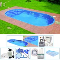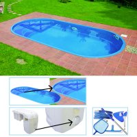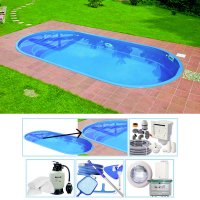 Questa piscina è realizzata in vetroresina stratificata, lo strato colorato è resistente ai raggi UV e cloro.