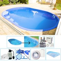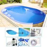 Questa piscina è realizzata in vetroresina stratificata, lo strato colorato è resistente ai raggi UV e cloro.
