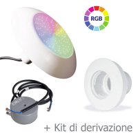 #4 / Kit illuminazione a LED LUCE RGB composto da: n.1 faro LED per bocchetta piscina Ø 297 mm RGB da 780 Lumen - 18 W per rivestimenti interni in liner PVC, n.1 bocchetta per piscina senza sfera orientabile, kit di derivazione faro, telecomando. Trasformatore non incluso.