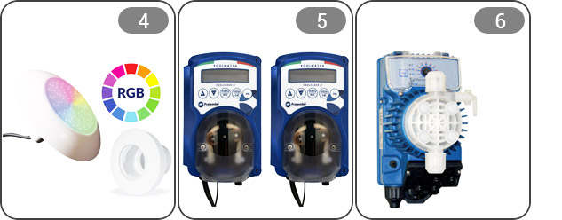 #5 / POMPE DOSATRICI per la regolazione automatica di cloro e pH per la misurazione e regolazione dei valori pH e cloro (redox), con display digitali. Le pompe sono pre-installate e cablate all'interno del locale tecnico. I prodotti chimici devono essere alloggiati all'esterno del locale tecnico (deve essere predisposto apposito spazio). Con queste pompe non è necessario installare lo sterilizzatore al sale.