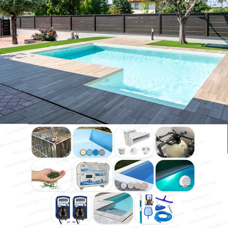 - Kit PRO: per chi è alla ricerca di un kit più completo. Comprende già alcuni tra gli accessori maggiormente richiesti come il kit di pulizia, i bordi in pietra ricostruita e il quadro elettrico.