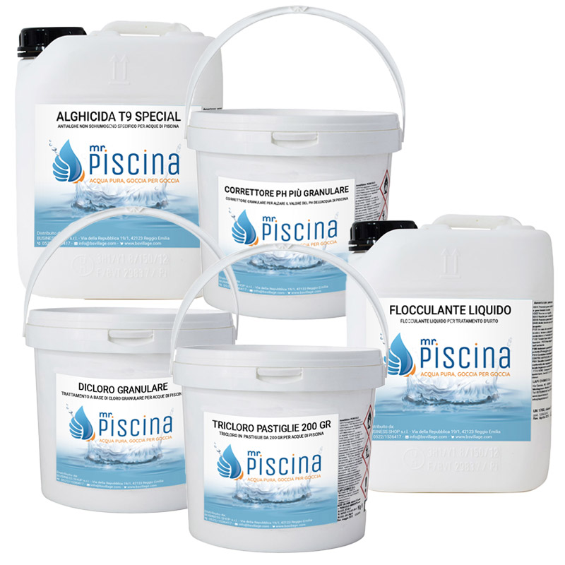 Prodotti chimici per il trattamento e la manutenzione dell'acqua della piscina, disponibili anche in kit apertura, manutenzione e chiusura
