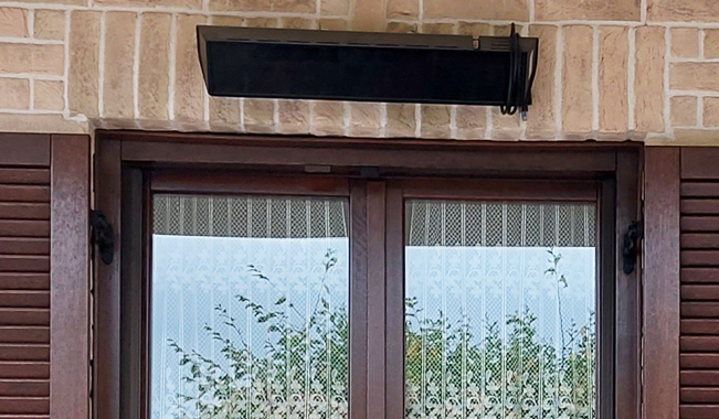 Pannello riscaldante realizzato in alluminio anodizzato con parti di fissaggio in acciaio inox. Grado di protezione IP65, adatto sia per l'utilizzo esterno che interno.