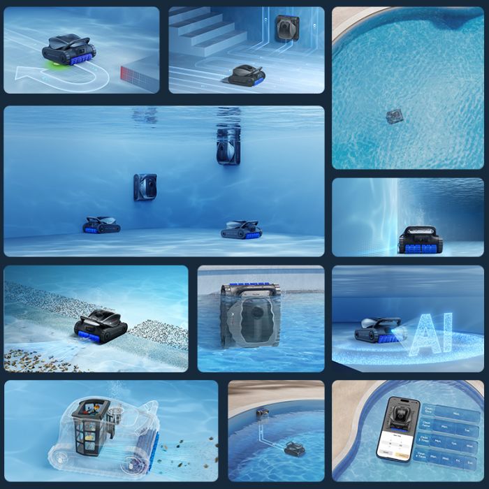 Il cuore della pulizia intelligente! Questo robot piscina a batteria utilizza tecnologia AI per garantire una pulizia completa e senza cavi, coprendo fondo, pareti e linea dell'acqua.