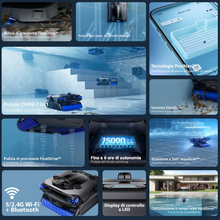 Rover X10 si contraddistingue per il suo sistema di pulizia OMNI 7 in 1 che ridefinisce la cura automatizzata della piscina.