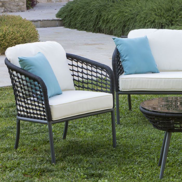 La struttura dei mobili è in alluminio verniciato a polvere di colore antracite. Braccioli e sedute sono formati da corda sintetica intrecciata alla struttura.