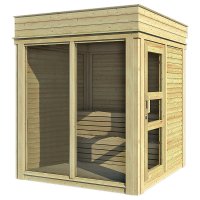 Questa sauna ha un design moderno e originale, ed è realizzata in legno di abete rosso del Nord di alta qualità prodotto secondo i criteri dell'ecosostenibilità.