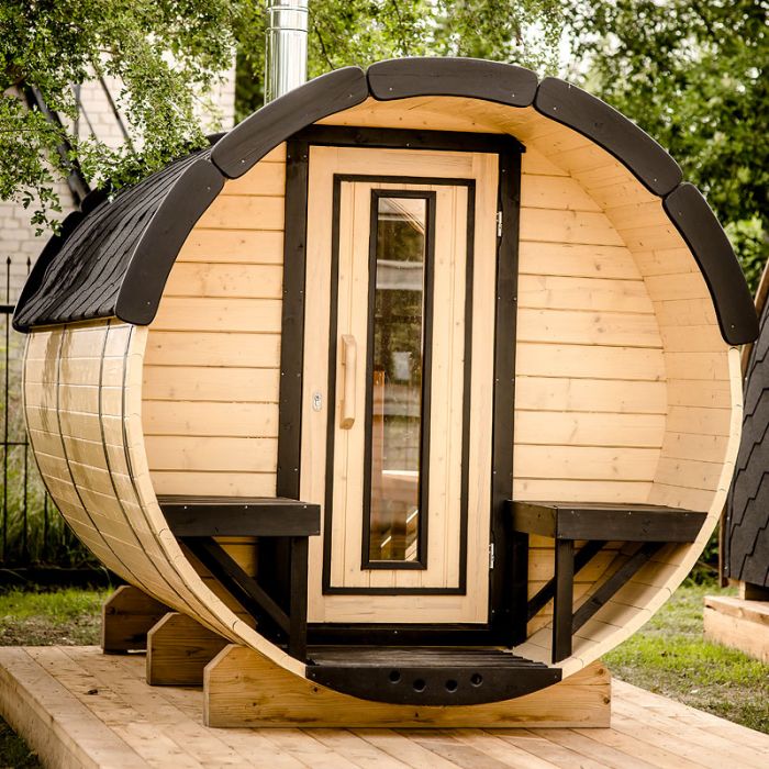 Sauna finlandese tradizionale da esterno PLUTONE con spogliatoio 6-8 posti 3,5 m Ø 1,9 m (CON O SENZA TERRAZZA)