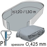 Rivestimento interno liner per piscine serie STEEL, modelli STEELDESIGN E STEELWOOD di forma ovale con dimensioni lunghezza da 7,55 a 7,65 x larghezza da 4,55 a 4,65 m ed altezza da 1,20 a 1,32 m.